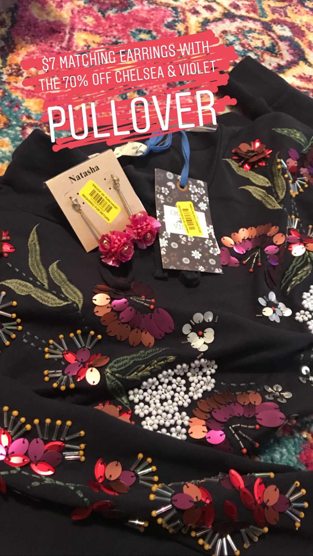 Chelsea and Violet sweater $100 for $30, earrings $7