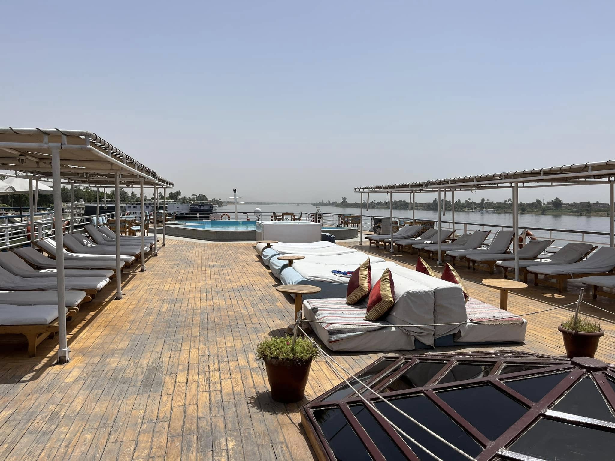 As someone who loves cruising, I can tell you most of these Nile Cruises are far from luxury, and there’s no possibility I can even recommend a particular one. There’s hundreds of them. I don’t even know the name of ours. They hold maybe 300 passengers maximum and are so plentiful that when they dock, they pull in shoulder to shoulder so that you have to walk through the lobbies of numerous ships to get to land.