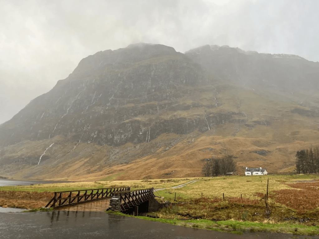 Driving through Glencoe is like nowhere else in the world. It was featured in James Bond Skyfall and it is immediately evident why. The scenery is breathtaking. The hills and valleys are lightly covered in fog and glow orange. Water streams down the mountainsides from the snow caps.